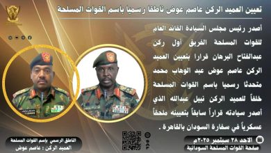 تعيين العميد الركن عاصم عوض ناطقا رسميا باسم القوات المسلحة أصدر رئيس مجلس السيادة القائد العام للقوات المسلحة الفريق أول…